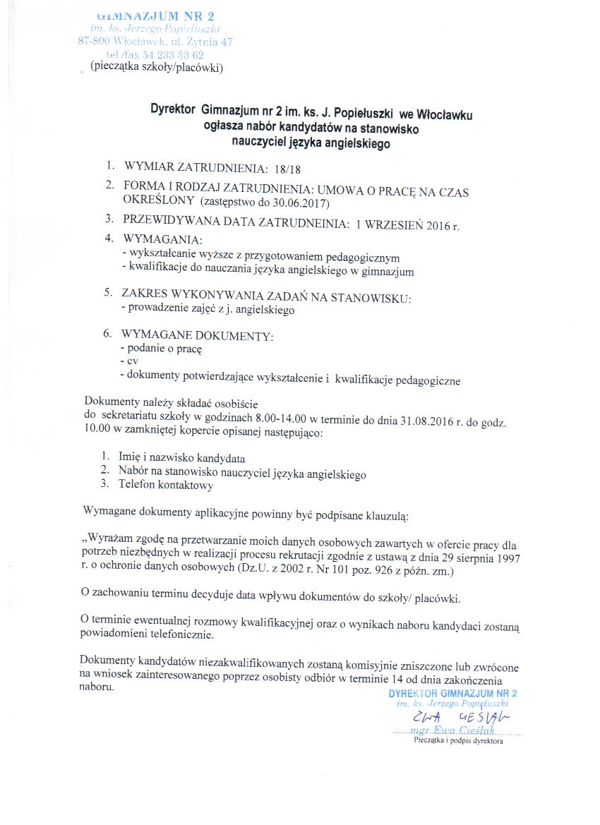 - Miejsce pracyGimnazjum nr 2 im. ks. Jerzego Popiełuszki we Włocławku